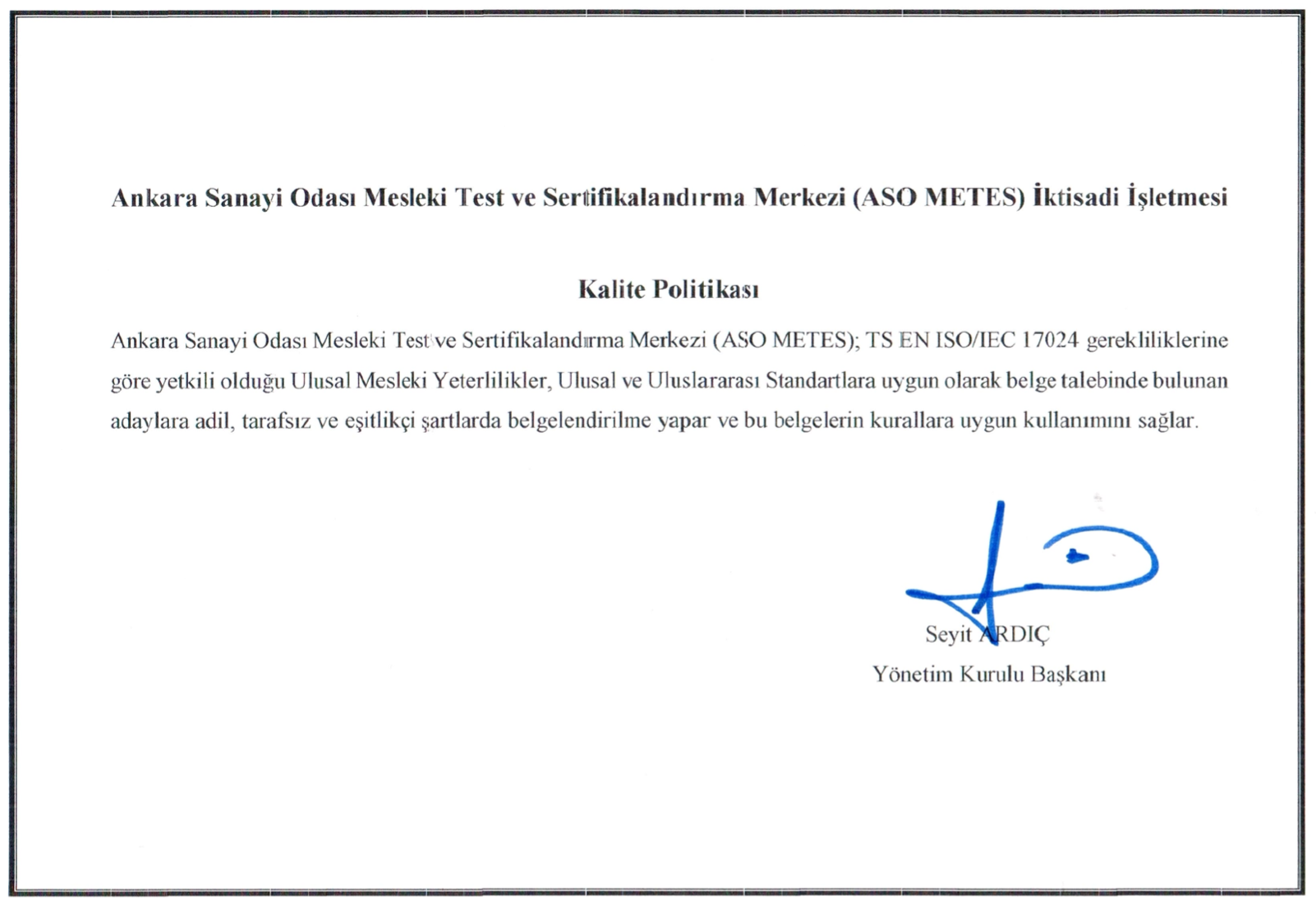 Ankara Sanayi Odası Mesleki Test ve Sertifikalandırma Merkezi (ASO METES) İktisadi İşletmesi Kalite Politikası.